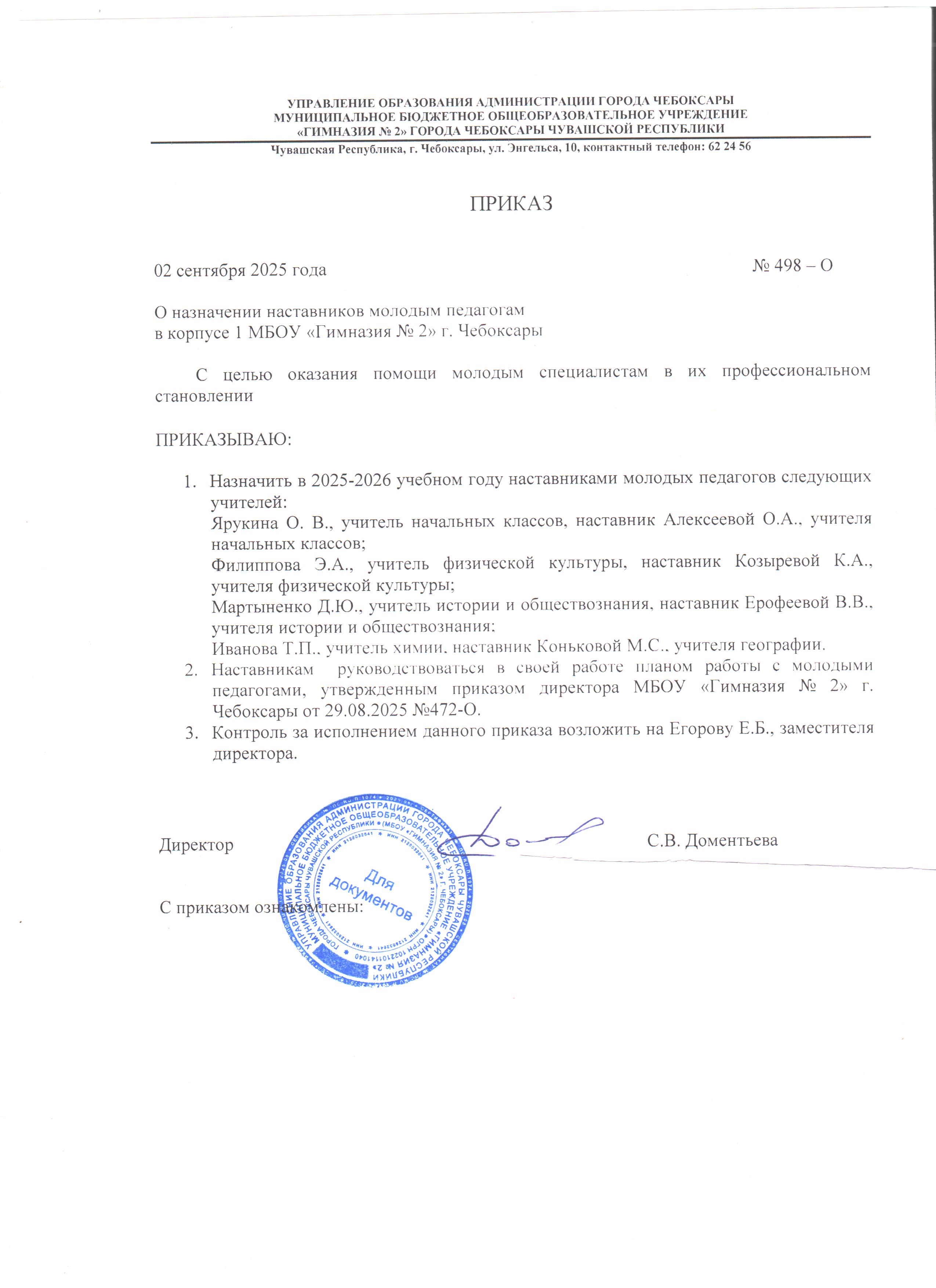 - Приказ №498-О "О назначении наставников молодым педагогам"