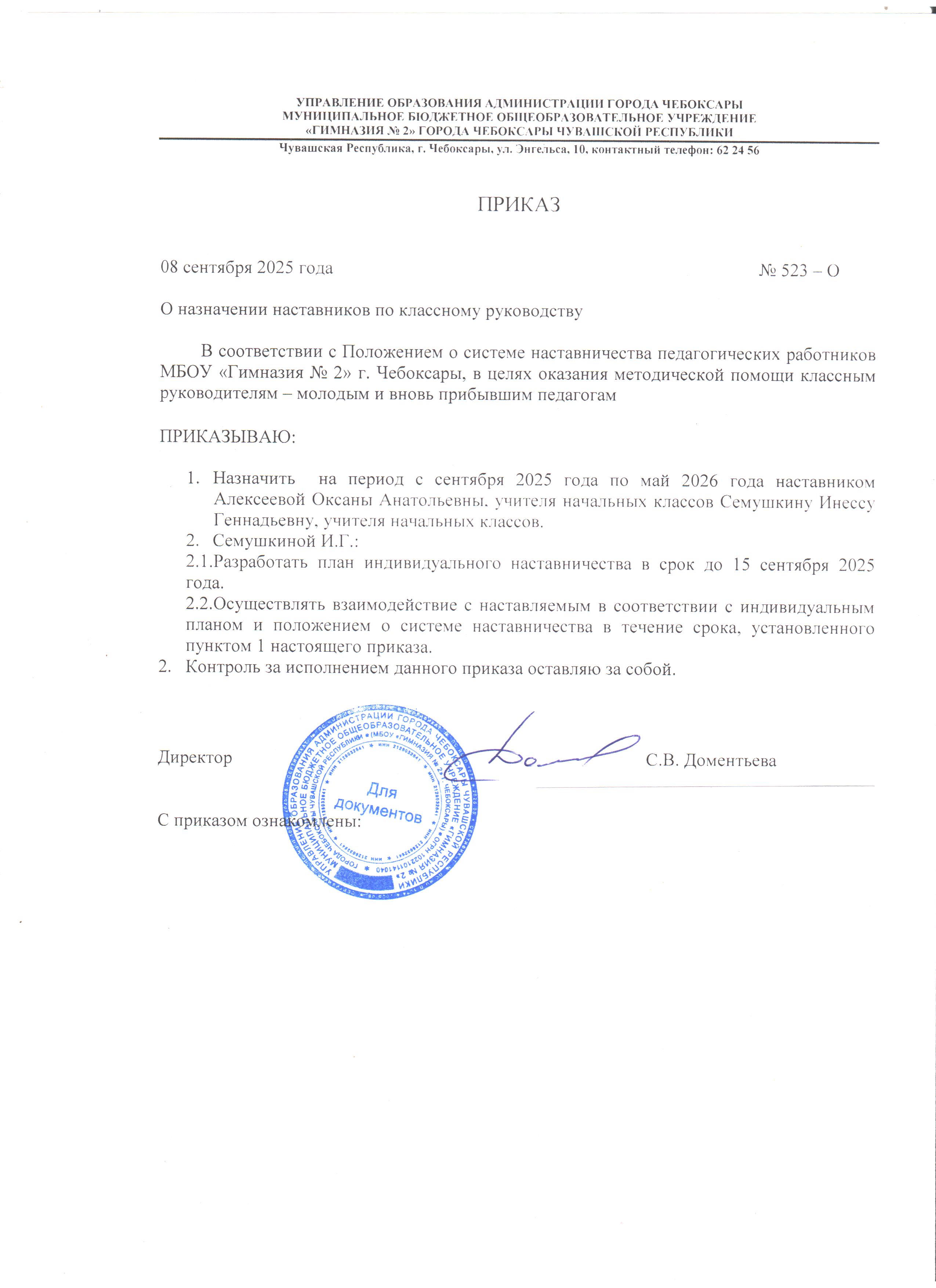 - Приказ №-523-О "О назначении наставников по классному руководству"